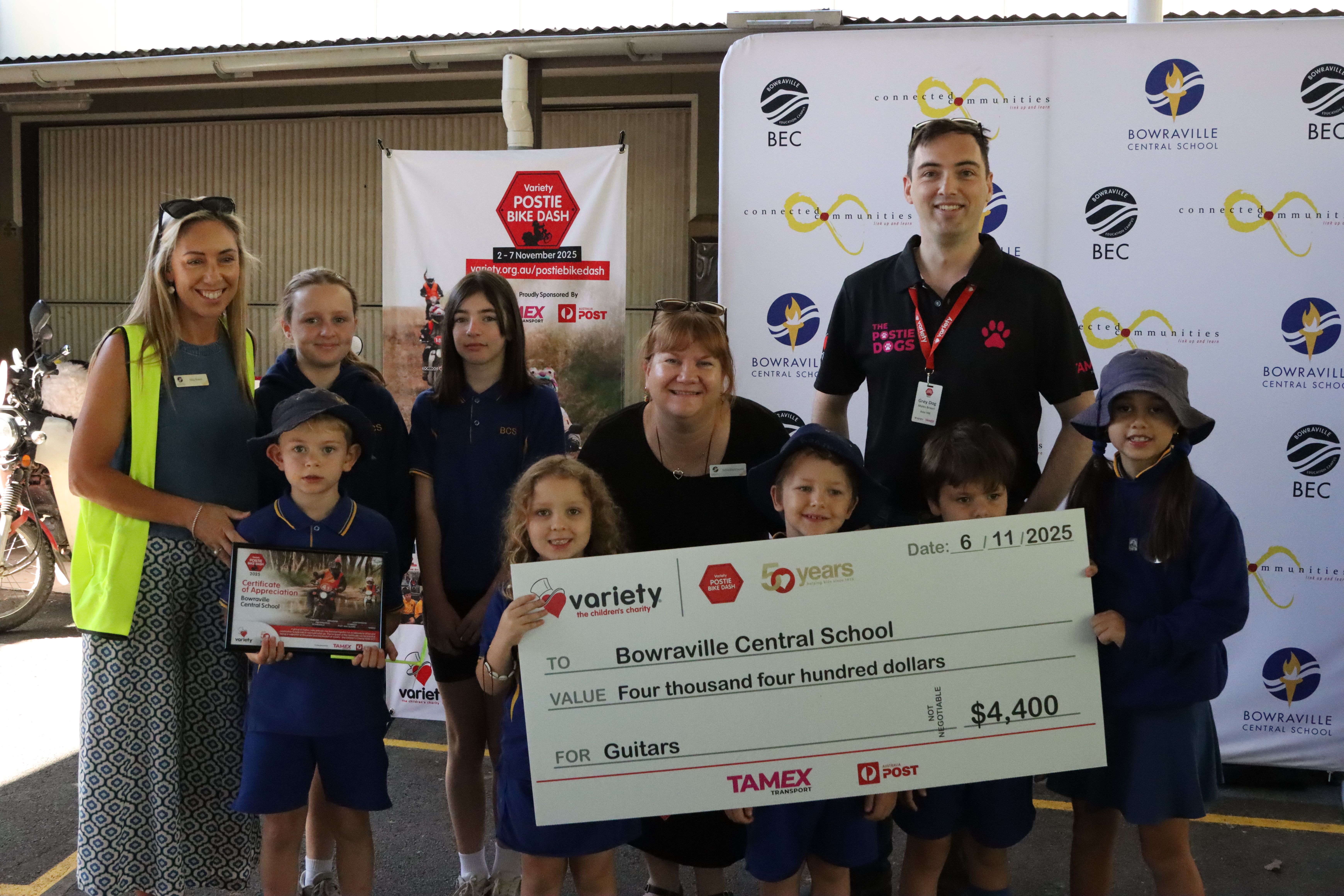 One of our most memorable stops on the 2025 Variety Postie Bike Dash was at Bowraville Central School where we delivered a grant of $4,400 for guitars and surprised the kids with 15 brand new kids to go into their Bike Education Program.